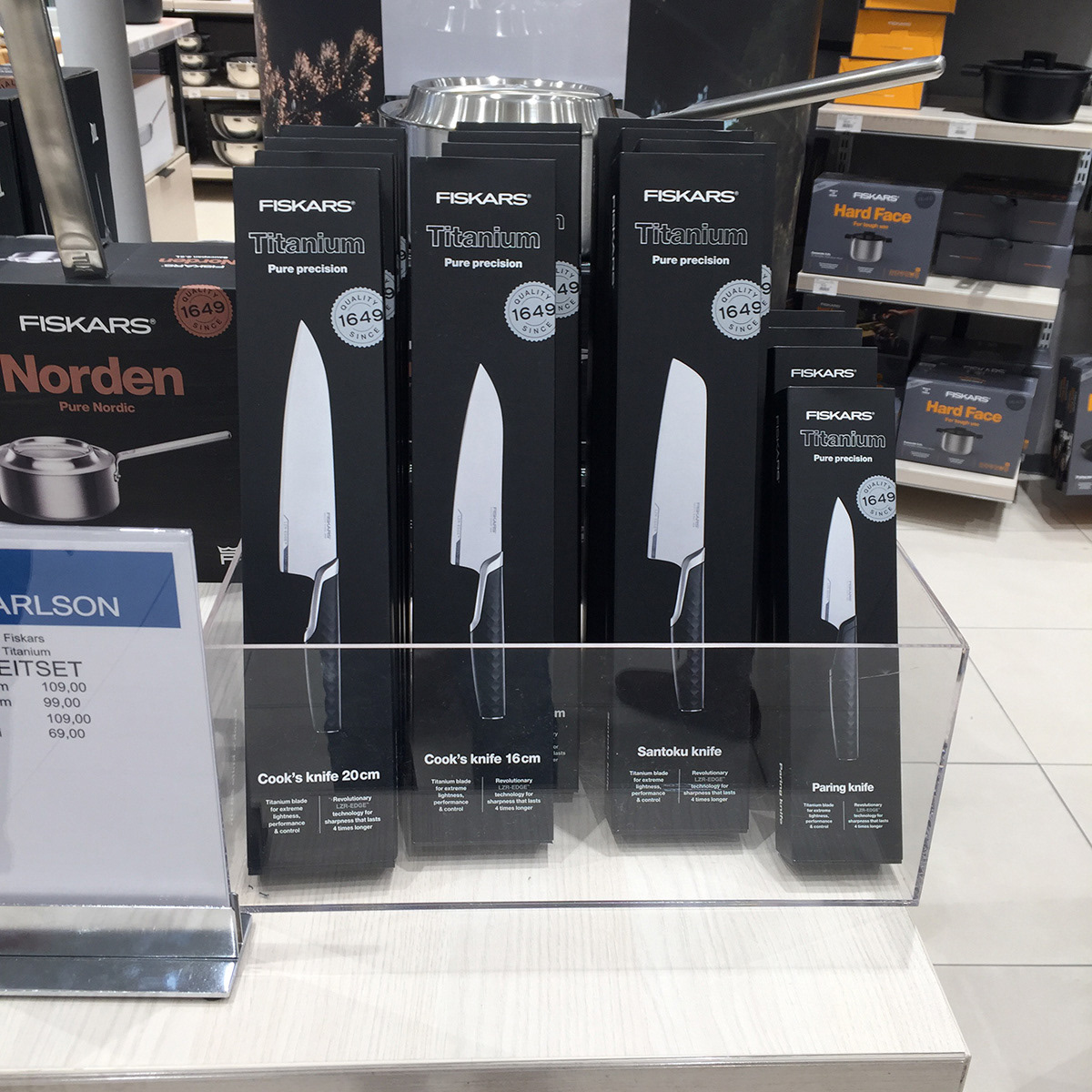 FISKARS Taiten Knife Range, the latest innovation in cutting with its new premium range of Titanium knives. Immune to rust and with the highest strength-to-weight ratio of all metals, titanium has long been celebrated as one of the world’s most useful materials. However, even though pure titanium has been popular in everything from aerospace projects to medical devices, it has not retained sharpness well enough to be used in kitchen knives.